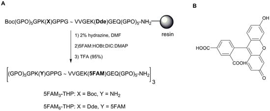 (A) Solid phase synthesis of 5FAM3-THP and 5FAM6-THP (“O” represents 4-hydroxyproline). The tilde represents the site of hydrolysis by gelatinases (B) 5-carboxyfluorescein (5FAM).