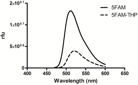 A fully substituted 5FAM-THP was desired in anticipation of maximized self-quenching of the fluorophores upon THP self-assembly. The Kaiser test showed the completed substitution of 5FAM on the ε-amino groups of Lys of both conjugates while the peptide was resin bound and verified a substitution level of three 5FAM: one THP for 5FAM3-THP and six 5FAM: one THP for 5FAM6-THP. By comparing the fluorescence of a fully proteolyzed sample of 5FAM-THP with an undigested sample, an average value of quenching of 32% ± 0.5% for 5FAM3-THP and 50% ± 2% for 5FAM6-THP of 5FAM fluorescence was observed in the THPs. The fluorescence emission spectra of the 5FAM-THPs showed a slight shift to the red relative to unconjugated 5FAM with no other perturbations, except a decrease in fluorescence, which was due to the close proximity of the fluorophores (Figure 2). We previously showed that for a THP substituted with 1.8 5FAM per six available ε-amino groups, there was 38% quenching [34]. In this study, similar quenching levels were observed with 5FAM3-THP. However, complete substitution of the ε-amino groups in the 5FAM6-THP conjugate resulted in 50% quenching of the fluorophores, which translated to a 2-fold increase in fluorescence after complete proteolysis.