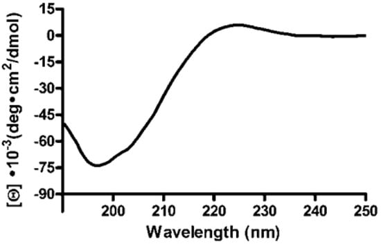 Circular dichroism spectra were collected over a range of λ = 190–300 nm on a JASCO J-815 instrument (Tokyo, Japan) using a 1 mm path length quartz cell at 10 °C. Temperature control was maintained with a Peltier equipped temperature control unit.