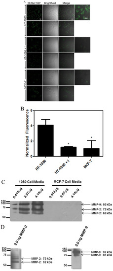 (A) Confocal fluorescence microscopy showing the hydrolysis of 5FAM6-THP by HT-1080 human fibrosarcoma cells. HT-1080 or MCF-7 human breast cancer cells were treated with 5FAM6-THP (1 µM) for 1 h. For inhibition studies, cells were pre-incubated with SB-3CT (1 µM) for 30’ prior to 5FAM6-THP incubation. Two image fields are shown per condition. The first column represents the fluorescence from 5FAM-THP. The second column represents the corresponding brightfield image. Overlays of the fluorescence and brightfield images are shown in the third column (taken using the 10× objective) with higher magnification images in the fourth column (taken using the 60× objective) to show cell internalization of 5FAM-THP. Scale bars are indicated in the first image of each column. (B) Mean cell associated fluorescence quantified with FV1000 software. (n = 10 cells, “I” denotes SB-3CT, “1080” denotes HT-1080 cells). P-values were determined using a Student’s two-tailed t-test; “*” denotes p < 0.05). (C) Zymogram depicting gelatinase content of cell-associated media with varying total protein loading. Varying levels of total protein from the conditioned media (0.41 µg, 2.07 µg, and 4.14 µg) were loaded into each well of a 10% Zymogram Gel with gelatin. Proteins were electrophoresed at 100 V for 90 min and after electrophoresis, the proteins were renatured in 2.5% Triton X-100. The gel was then incubated overnight at 37 °C in development solution and stained with Coomassie Blue. (D) Zymograms of MMP-2 and MMP-9 standards that were used in enzymology experiments and in Figure 6C to verify gelatinase content of cell-associated media.