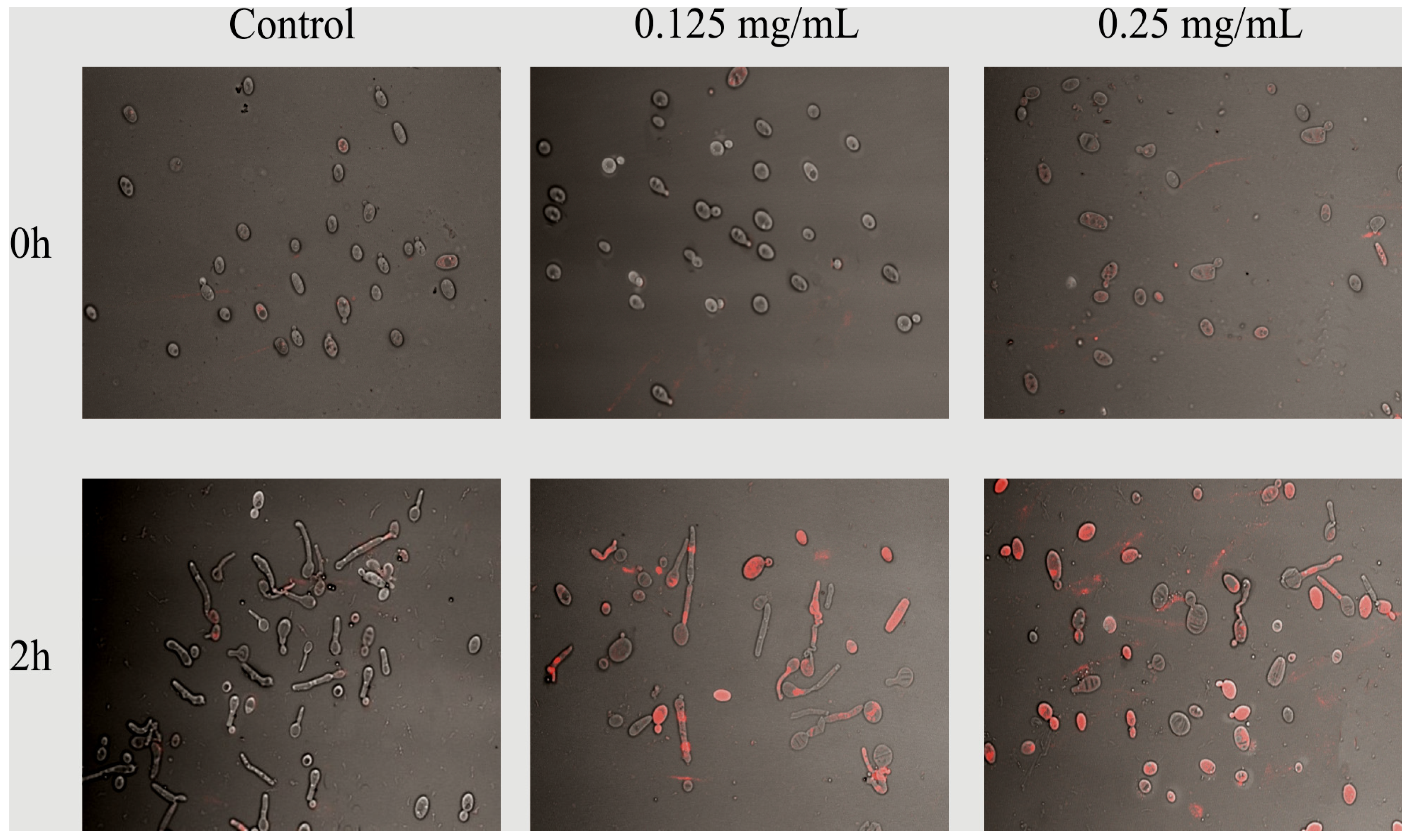 C. albicans control and T. alexandrinum SAPF—treated cells (at concentration of 0.125, 0.25 mg/mL) stained after 0 and 2 h of co-incubation with propidium iodide (60 µM). Undamaged cells (gray/transparent) and the cells with impaired cell wall permeability (red) were determined using a Confocal Laser Scanning Microscope (PI fluorescence detected at the excitation of 543 nm). The presented images are representative from two independent experiments.