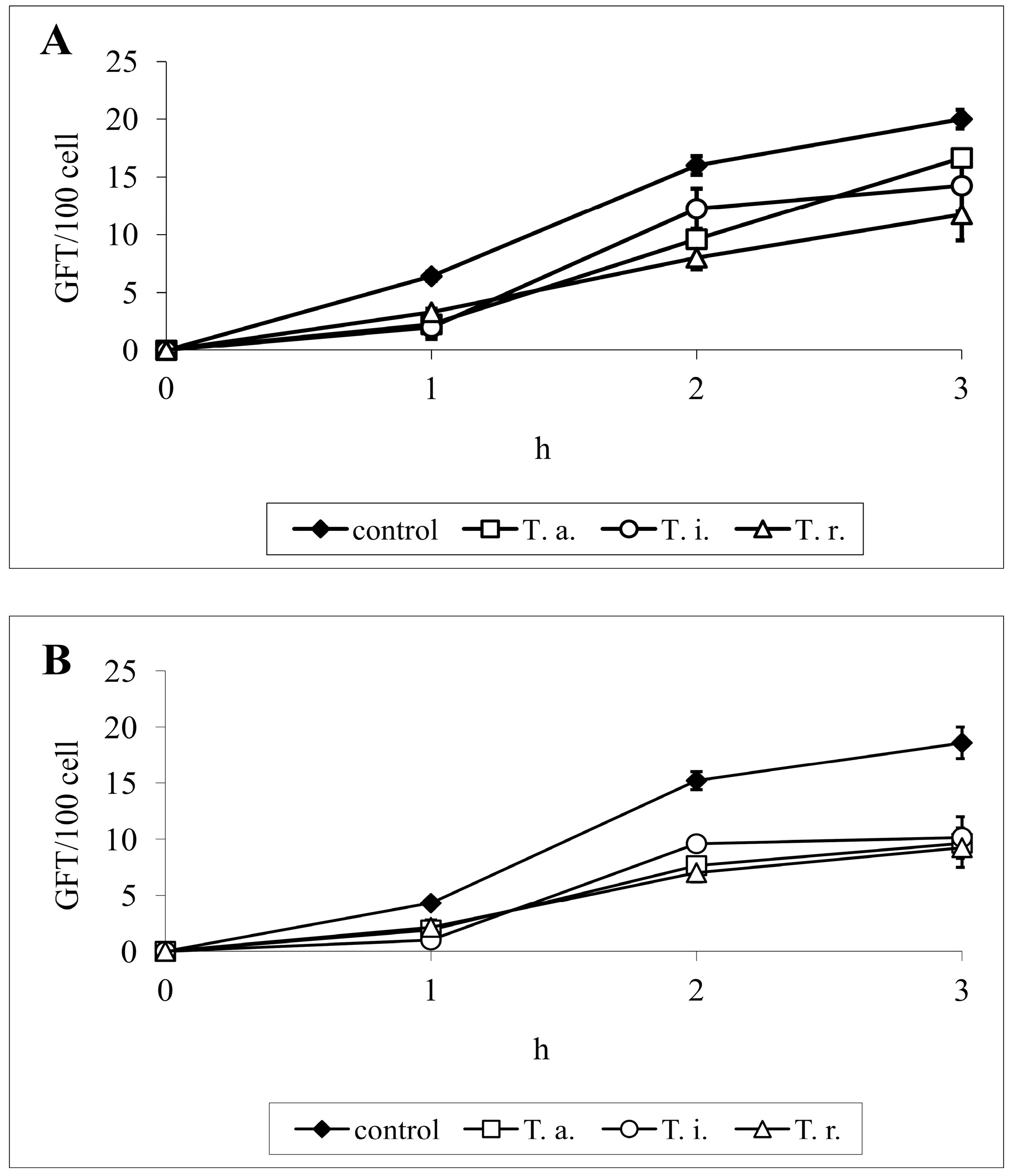 Kinetics of C. albicans ATCC 10231 germ tube formation after 1, 2, 3 h of incubation in RPMI-FCS medium in the presence of T. alexandrinum SAPF (A)—0.125 mg/mL or (B)—0.25 mg/mL. The results are expressed as mean GFT/100 cells ± S.D., evaluated at each time point. T. a.—Trifolium alexandrinum; T. i.—T. incarnatum; T. r—T. resupinatum.