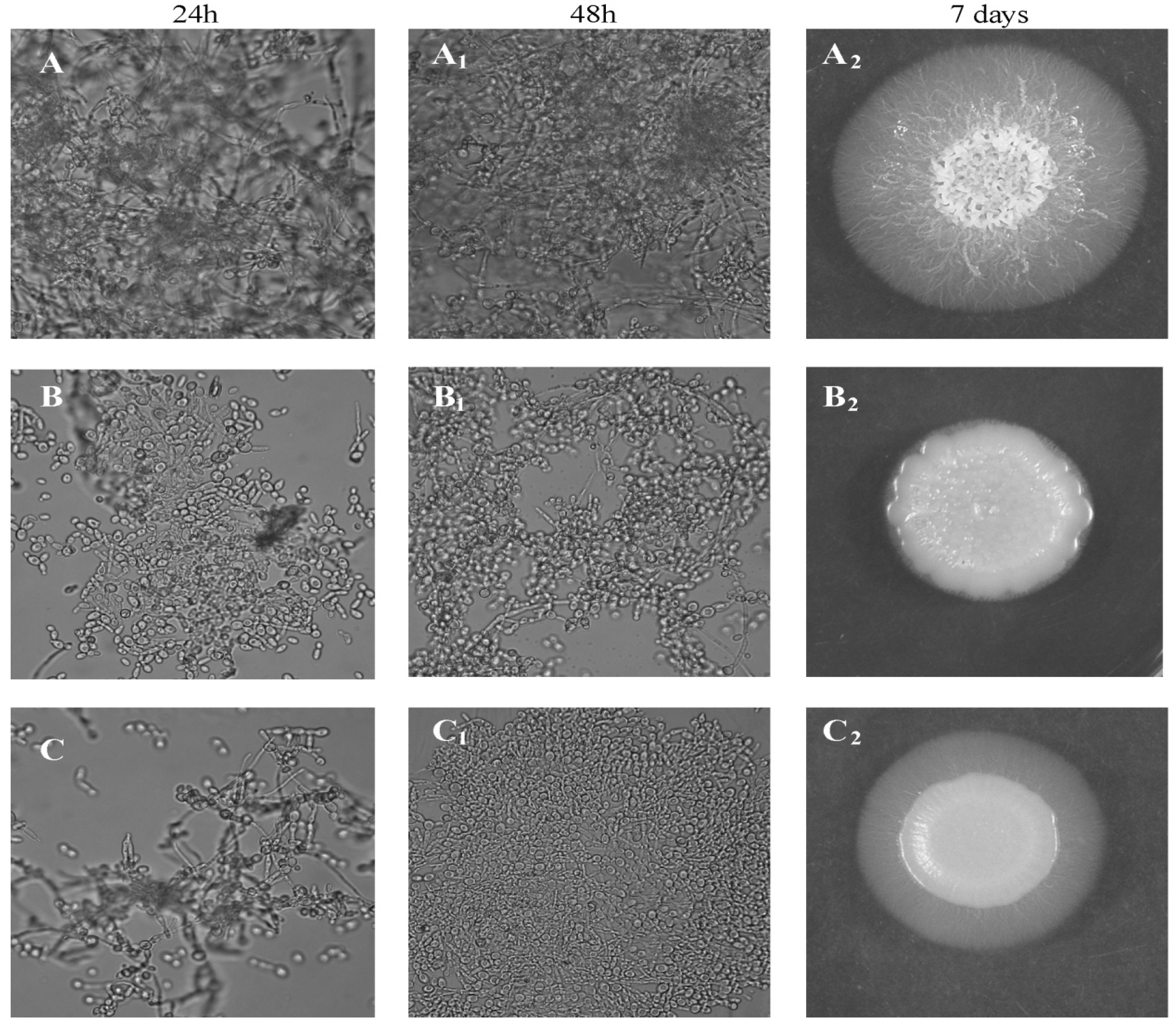 Hyphae formation (left and middle columns) by C. albicans ATCC 10231 strain cultured in RPMI-FCS medium in the absence (A, A1) or presence of T. alexandrinum SAPF at concentration of 0.25 mg/mL (B, B1) or at concentration of 0.125 mg/mL (C, C1), tested after 24 h or after 48 h. At the indicated time points of culture, samples were withdrawn, evaluated microscopically (light microscope 400× magnification). Mycelium formation (right column) by C. albicans ATCC 10231 colonies grown for 7 days at 30 °C on (A2)—control Spider medium; (B2)—Spider medium + SAPF 0.25 mg/mL; (C2)—Spider medium + SAPF 0.125 mg/mL. The presence or lack of hyphal growth at the colony edges was determined using a stereomicroscope (12× magnification). The presented images are representative from two independent experiments.