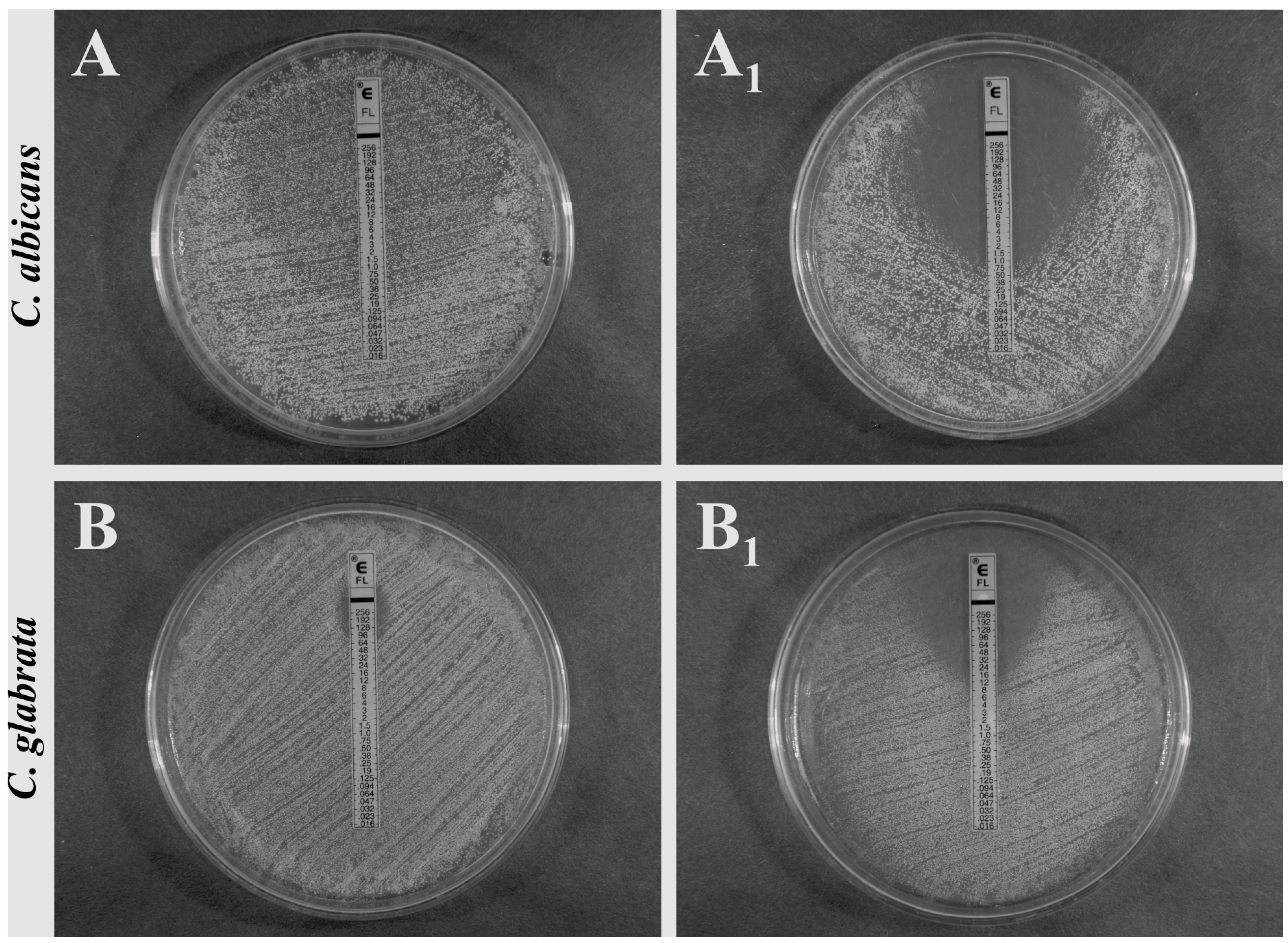 Synergistic activity of T. alexandrinum SAPF (0.25 mg/mL) with fluconazole towards C. albicans ATCC 10231 and C. glabrata clinical strain, measured by the antibiotic gradient strip (E-test). The growth inhibition zones/MIC were measured after yeasts growth at 37 °C for 24–48 h on control medium: RPMI-1640 with 2% glucose (A,B) or on medium + SAPF (A1,B1). The test end-points were evaluated according to the manufacturer’s recommendations. The presented images are representative from two independent experiments.