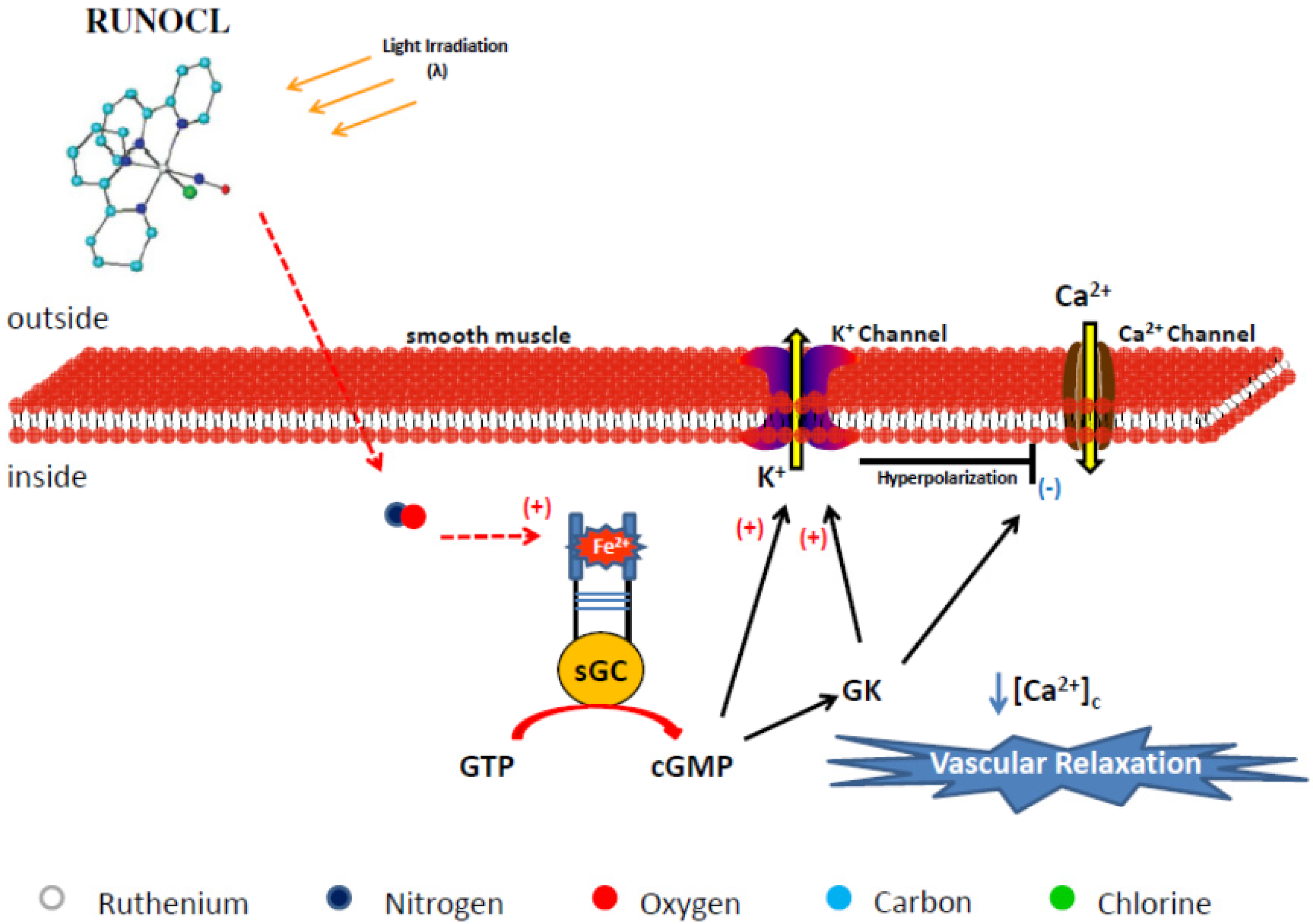 - Lunardi, C.N.; Cacciari, A.L.; da Silva, R.S.; Bendhack, L.M. Cytosolic calcium concentration is reduced by photolysis of a nitrosyl ruthenium complex in vascular smooth muscle cells. Nitric Oxide 2006, 15, 252–258. [Google Scholar] [CrossRef]