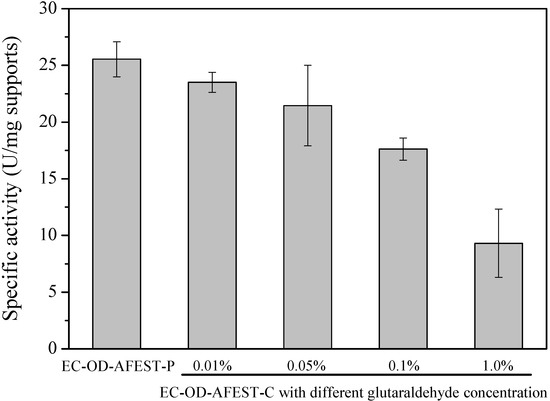 Using macroporous resin Sepabeads EC-OD as carrier, the cross-linked immobilized thermophilic esterase was prepared via a two-step route, as shown in Scheme 1. The first step is to adsorb enzymes on the macroporous resins and the second step is to crosslink the adsorbed enzymes via glutaraldehyde chemistry, resulting in a cross-linked immobilized thermophilic esterase on the surface of macroporous resins. As reported previously [13], the thermophilic esterase AFEST was partially purified, with an active protein content of 92% (w/w) in the enzyme preparation, and the specific activity of lyophilized enzyme was approximately 168 U/mg toward p-nitrophenyl caprylate at 80 °C. Through the physical adsorption for 24 h, the adsorption efficiency was measured to be 76%, and thus the loading of AFEST on supports was calculated as 152 mg AFEST/g supports [24]. After the physical adsorption, cross‑linking of enzymes on the surface of supports was then conducted through the treatment with different concentrations of glutaraldehyde. Generally, two key factors should be considered in the glutaraldehyde treatment process: the prevention of enzyme leaching and the maintenance of catalytic activity [30]. During the glutaraldehyde treatment, almost no protein leaching was detected, indicating 0.01% glutaraldehyde was just enough to prevent the enzymes leaching out. For the specific activity, the glutaraldehyde concentration has a great influence on the enzymatic activity. As shown in Figure 1, with the increasing of glutaraldehyde concentration, the specific activity would be decreased, with only 9.31 U/mg supports after 1.0% glutaraldehyde treatment. Here, both 0.01% and 0.05% glutaraldehyde treatment could produce the immobilized enzymes with relatively higher catalytic activity.