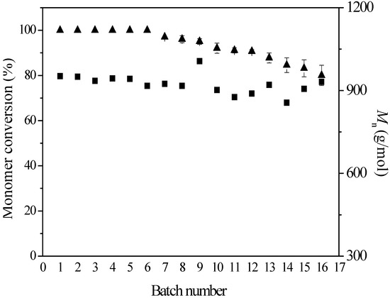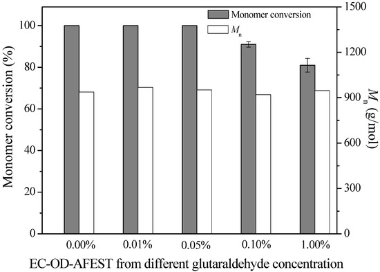 Meanwhile, the Mn values were kept at a relatively constant value (850–1010 g/mol). Nevertheless, using immobilized enzyme EC-OD-AFEST-P prepared through physical adsorption as a catalyst, monomer conversion values showed a distinct declining tendency in the five repeated uses, from 100% (1st batch) to 36% (5th batch) [24]. Therefore, the combination of physical adsorption and glutaraldehyde-mediated crosslinking could be used to construct immobilized enzymes with better operational stability, avoiding the loss of adsorbed enzymes from the supports during the reactions.