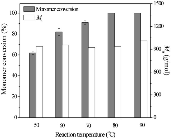 The effect of temperature on monomer conversion and product molecular weight was investigated at different temperatures in toluene for 72 h. As shown in Figure 3, it was obvious that high temperature was favorable for the reactions. After 72 h, the monomer conversion increased from 62% at 50 °C to 100% at 80 °C or 90 °C. However, different from free enzyme [13], the temperature exhibited no effects on the product molecular weight, in the range of 920–1010 g/mol. As there were no significant differences between reactions at 80 and 90 °C, 80 °C was selected as the optimal reaction temperature for the immobilized enzyme-catalyzed PCL synthesis. Thus, both the intrinsic high thermostability of AFEST and stabilization of immobilization technique made the immobilized enzyme more suitable for polyester synthesis at a larger scale, and even for realizing the simultaneous, single-step chemoenzymatic synthesis of novel polymers.