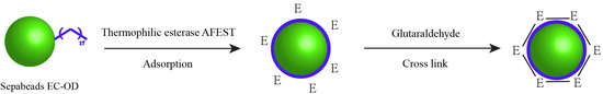 The thermophilic esterase AFEST was purified from the recombinant E. coli BL21 strain harboring the gene AF1716 from A. fulgidus according to the previous reports [13,24,34]. The esterase activity was monitored by measuring the amount of p-nitrophenyl using p-nitrophenyl caprylate as substrate at 80 °C [35], and one unit of activity was defined as the protein amount releasing 1 μmol p-nitrophenyl in one minute. After the purification of thermophilic esterase AFEST, the cross-linked immobilized thermophilic esterase was prepared. Briefly, Sepabeads EC-OD (0.5 g) was washed with ethanol, distilled water and 50 mM phosphate buffer (pH 8.0) twice, and then mixed with 100 mL enzyme solution (1 mg/mL, 50 mM phosphate buffer (pH 8.0)). The vial was incubated at room temperature in a shaking condition (200 rpm) for 24 h. The samples were filtrated, washed with 50 mM phosphate buffer (pH 8.0), and incubated in the same buffer containing various glutaraldehyde concentration (0, 0.01, 0.05, 0.1 and 1% w/w) at 200 rpm for an additional 30 min. After the glutaraldehyde treatment, the cross-linked immobilized enzyme EC-OD-AFEST-C was obtained through filtration, washing with 50 mM phosphate buffer (pH 8.0) and lyophilization. The immobilized enzyme prepared via physical adsorption was named as EC-OD-AFEST-P. The immobilization process was monitored by measuring the enzymatic activity and protein concentration in the supernatant. The enzymatic activity reported was the average of three experiments, and the error represented the standard deviation of those trials. The adsorption efficiency (%) was defined as the ratio of adsorption activity to total activity in the supernatant. The loading of AFEST on the supports (mg AFEST/g supports) was calculated, based on the adsorption efficiency and initial amount of enzyme.