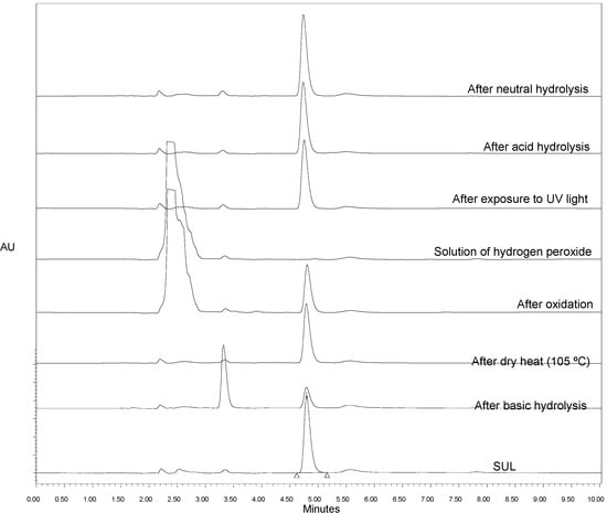 To ensure the reliability of the analytical results, the methodology used to dose the SUL must be validated. An analytical method is considered officially validated when the associated parameters, such as precision, accuracy, linearity, limit of detection and quantitation, specificity and robustness, are adequate [10]. The specificity can be assessed from the analyte when the analyte is subjected to stress conditions, also known as the intrinsic or inherent stability. Stress conditions include the effects of temperature, moisture, oxidation, exposure to light and hydrolysis at different pH values [11].