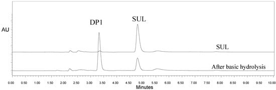 The chromatographic analysis was performed by HPLC using an optimized and validated methodology. The standard solution was prepared from the SUL standard with a declared content of 99.8% and at a concentration of 0.01 mg·mL−1.