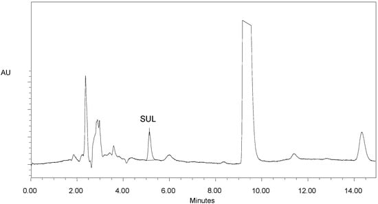 The analytical methodology proposed for the analysis of SUL was optimized and validated with a mobile phase consisting of acetonitrile—phosphoric acid 0.1% (60:40), a 5 µm RP-18 Sunfire® column measuring 250 mm × 4.6 mm with a RP-18 Sunfire® pre-column, a flow rate of 1 mL·min−1, an injection size of 10 µL with detection at 220 nm, a column temperature of 30 °C.