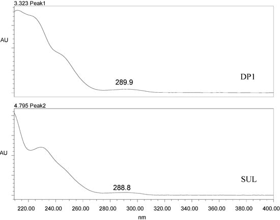 Spectra obtained using the UV/DAD detector in the range from 200 to 400 nm for the peaks relative to the product formed by cleavage of the lactone ring (DP1) and sulfentrazone (SUL).