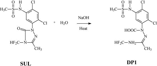 The reaction scheme of the basic hydrolysis of sulfentrazone (SUL), giving rise to DP1, which is the product formed by cleavage of the lactone ring.