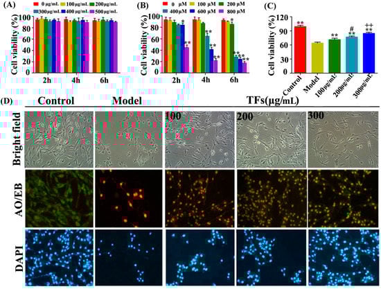 Protective effects of the TFs on H2O2-induced cell injury in PC12 cells. (A) Dose- and time-dependent effects of TFs on cell viability; (B) Dose- and time-dependent effects of H2O2 on cell viability; (C) Pretreatment with TFs (100, 200 and 300 μg/mL,1 h) alleviated H2O2-induced cell injury; (D) Morphological and Fluorescence images of PC12 cells stained by AO/EB and DAPI (100×, final magnification). Datas are presented as mean ± SD (n = 5). * p < 0.05 and ** p < 0.01 compared with model group. # p < 0.05 representes the comparison between 100 μg/mL and 200 μg/mL treatment groups, and ++ p < 0.01 representes the comparisons between 200 μg/mL and 300 μg/mL treatment groups.