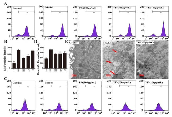 The levels of ROS and Ca2+ were measured treatment with H2O2 for 4 h. As shown in Figure 2A,B, H2O2 markedly increased the ROS level in the model group, which was markedly decreased by the TFs (300 μg/mL). In addition, the level of Ca2+ in the model group was significantly increased by H2O2, and was decreased by the TFs, and there were no difference between the different doses (100–300 μg/mL) of the treatment groups (Figure 2C,D).