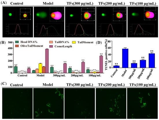 The single cell gel electrophoresis technique was used to detect DNA damage. As shown in Figure 3A,B, the nucleus of the cells was intact and round in shape, and DNA was maintained in the nuclear matrix in the control group. In the model group, DNA damage was detected and the Comet Length was much longer than that of in control group (p < 0.01). However, pretreatment with TFs (100, 200 and 300 μg/mL) for 1 h significantly improved DNA damage including Head DNA%, Tail DNA%, Tail Moment and Olive Tail Moment.