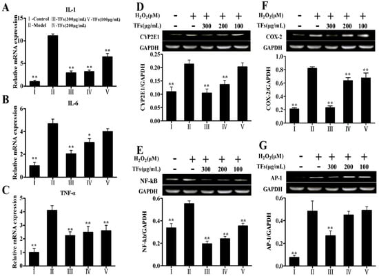 Effects of the TFs on the gene expressions of IL-1 (A), IL-6 (B), TNF-α (C), and protein expressions of CYP2E1 (D), NF-kb (E), COX-2 (F), and AP-1 (G). Values are expressed as mean ± SD (n = 5). * p < 0.05 and ** p < 0.01 compared with model group.