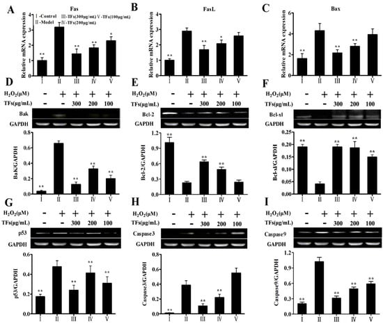 Effects of the TFs on the gene expressions of Fas (A), FasL (B), Bax (C), and protein expressions of Bak (D), Bcl-2 (E), Bcl-xl (F), p53(G), caspase-3 (H) and caspase-9 (I). Values are expressed as mean ± SD (n = 5). * p < 0.05 and ** p < 0.01 compared with model group.