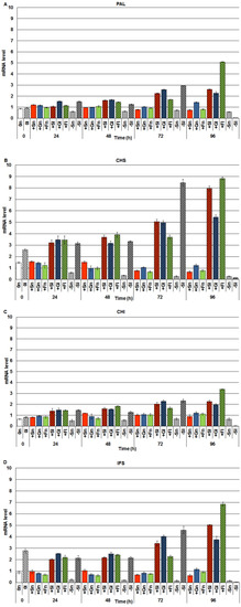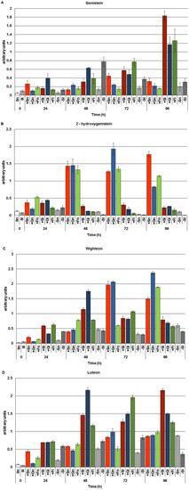 Real-time PCR analyses of the level of mRNA encoding enzymes involved in the synthesis of isoflavones, including genistein, revealed post-infection accumulation of mRNA in embryo axes of yellow lupine cv. Juno (Figure 2). In embryo axes infected with F. oxysporum cultured in vitro on the medium with sucrose, glucose and fructose (+Si, +Gi, +Fi) the level of mRNA for PAL, CHS, CHI and IFS was higher than in non-infected axes (+Sn, +Gn, +Fn) in the period from 0 to 96 h. Moreover, up to 72 h after inoculation in inoculated axes with a sugar deficit (−Si) a higher level of mRNA encoding PAL, CHS, CHI and IFS was observed post infection in relation to non-inoculated axes (−Sn). At the next time point after inoculation, i.e., at 96 h in infected axes cultured at carbohydrate deficit (−Si) a very strong reduction was recorded in the mRNA level, while at 96 h in infected axes with a high level of carbohydrates (+Si, +Gi and +Fi) the level of mRNA encoding the above mentioned enzymes was the highest. It needs to be stressed that a very high post-infection level of mRNA was recorded for enzymes of the specific isoflavone synthesis pathway, i.e., CHS and IFS (Figure 2B,D) in embryo axes inoculated with F. oxysporum, being much higher than for PAL and CHI (Figure 2A,C).
