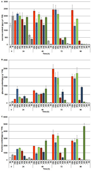 GC-MS analyses of the carbohydrate levels showed that after exogenous administration of sucrose, glucose and fructose the endogenous level of these sugars increased strongly in embryo axes of yellow lupine cv. Juno (Figure 3). Levels of sucrose and monosaccharides (glucose and fructose) in embryo axes of yellow lupine cultured in vitro with an addition of sucrose (+Sn), glucose (+Gn) and fructose (+Fn) was much higher than in embryo axes cultured at carbohydrate deficit (−Sn). A very strong endogenous decrease in the levels of sucrose (Figure 3A) and monosaccharides (glucose and fructose) (Figure 3B,C) was observed at 72 h after infection in embryo axes cultured in the presence of these carbohydrates. At 96 h after infection the level of sucrose decreased even further (Figure 3A), while the content of fructose in +Fi tissues increased considerably and was higher than in the other experimental variants (Figure 3C).