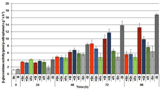 Analyses of β-glucosidase activity in the period from 0 to 96 h of culture showed a post-infection increase in the activity of this enzyme in inoculated embryo axes both cultured in the presence of sucrose, glucose and fructose, and under carbohydrate deficit (Figure 4). However, the activity of this enzyme was higher in embryo axes infected with F. oxysporum cultured at carbohydrate deficit (−Si) than in the infected embryo axes cultured in the presence of sugars, i.e., (+Si, +Gi, +Fi). The highest activity of β-glycosidase was recorded at 96 h after inoculation.