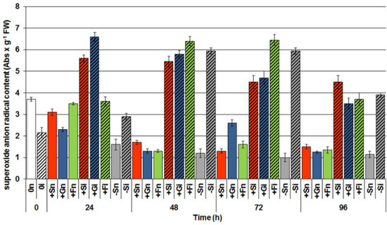 Results of investigations recorded within this and previous studies [9,42] showed a post-infection increase in the activity of β-glycosidase (Figure 4); however, it is not dependent on the level of carbohydrates in tissues. In embryo axes with high endogenous levels of sucrose, glucose and fructose (Figure 3), showing a considerable accumulation of isoflavones, including genistein (Figure 1), and a high level of expression of genes encoding enzymes of genistein biosynthesis (Figure 2), also a very strong generation of O2•− was observed in their tissues (Figure 5). As early as 24 h and at the further time points post infection in embryo axes infected with F. oxysporum a very strong generation of this radical was found in cultures run on the medium with glucose, fructose and sucrose (Figure 5). Obviously, generation of O2•− in these tissues is connected with the adopted defence strategy in infected embryo axes with a high carbohydrate level. During later stages after inoculation, lower generation of semiquinone radicals in +Si, +Gi and +Fi tissues in relation to −Si is probably connected with the strengthening and sealing of cell walls (Figure 6).