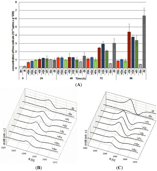 was higher in embryo axes with high endogenous levels of sucrose, glucose and fructose than in those with sugar deficits (Figure 6). At that time point it was observed that infection with F. oxysporum resulted in enhanced generation of these radicals in infected embryo axes with a carbohydrate deficit (−Si) in relation to those non-infected (−Sn). At further time points after inoculation with F. oxysporum, i.e., at 72 and 96 h, concentrations of these radicals increased considerably, both in −Si and +Si, +Gi and +Fi embryo axes and it was much greater than in non-infected embryo axes (−Sn, +Sn, +Gn, +Fn) (Figure 6A). However, at 96 h after inoculation the concentration of these radicals was the highest in embryo axes with carbohydrate deficit (−Si), being higher than in infected embryo axes with a high endogenous carbohydrate level.