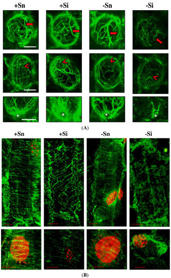 A particularly high accumulation of actin was observed in the vicinity of cell nuclei. Additionally, when cells were inoculated with F. oxysporum (+Si), bundles of actin were observed to thicken and fluorescence intensity increased in relation to +Sn cells. Quantitative analysis indicated a significant increase in the global density of microfilaments (MFs) in cells. This increase resulted mainly from an increase in occupancy regions of high fluorescence, which corresponded to actin cables (Figure 8A).