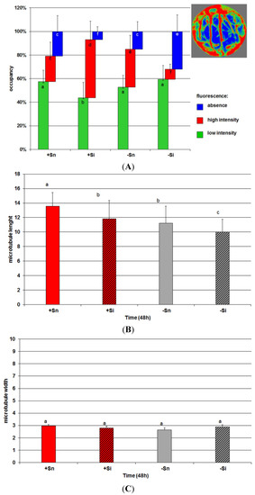 Tubulin cytoskeletons +Sn, +Si and −Sn cells of cortex in embryo axis (in horizontal section of cells) consisted of microtubules, which created bundles structure parallel to each other (Figure 7B). For the most part, these bundles were situated perpendicularly to the longer axis of the cell, and only occasionally at a small angle. In comparison to +Sn, in +Si and −Sn variants only slight changes were observed. Their structure was usually intact. Their reciprocal arrangement rarely changed. Therefore the cells, which were observed, had their microtubules bundles randomly scattered i.e., within a cell there were regions, where bundles were more or less densely packed than in other regions. Moreover, the length of microtubules bundles in +Si and −Sn cells of embryo axes was a little shorter than in +Sn (Figure 8B). The width of microtubules bundles was not changed (Figure 8C). The tubulin cytoskeleton in −Si cells showed the most visible disorders i.e., a decline or a considerable reduction of the number of microtubules, a significant shortening of length (fragmentation) of microtubules (Figure 8B), occurrence of big, irregularly shaped tubulin aggregates displaying strong fluorescence and the region with diffusive character of fluorescence (Figure 7B).