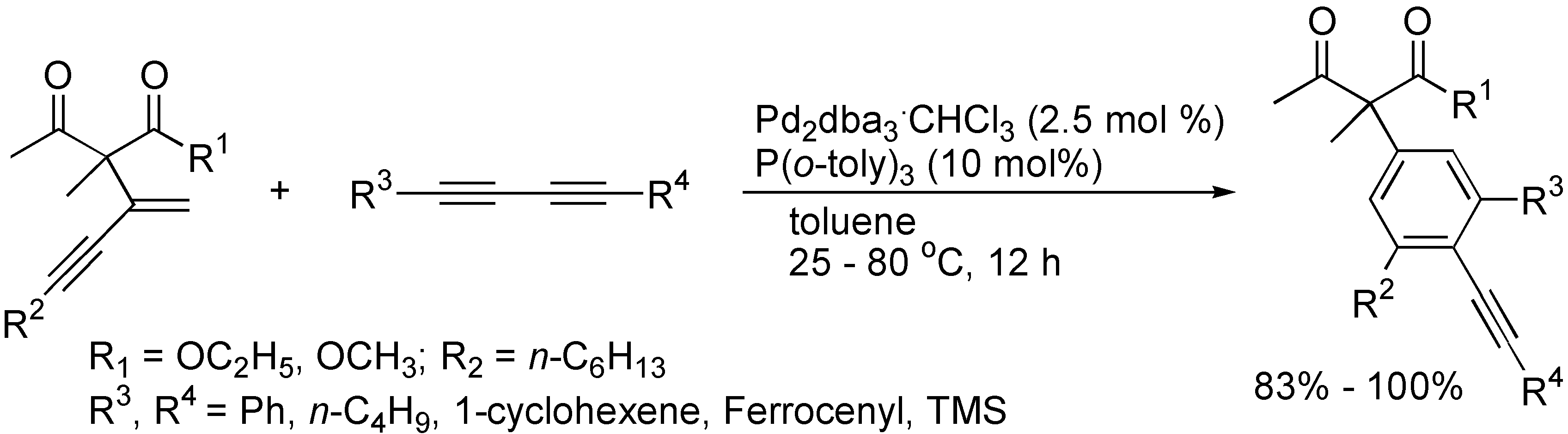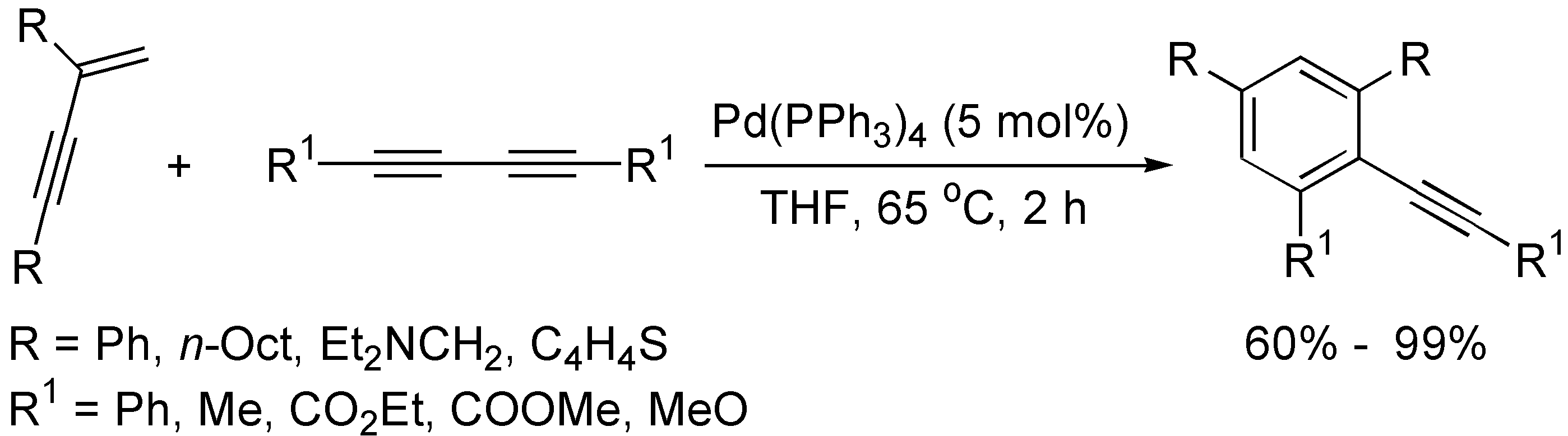 - Gevorgyan, V.; Takeda, A.; Yamamoto, Y. First intermolecular regiospecific palladium-catalyzed enyne-diyne [4+2] cross-benzannulation reaction. J. Am. Chem. Soc. 1997, 119, 11313–11314. [Google Scholar] [CrossRef]