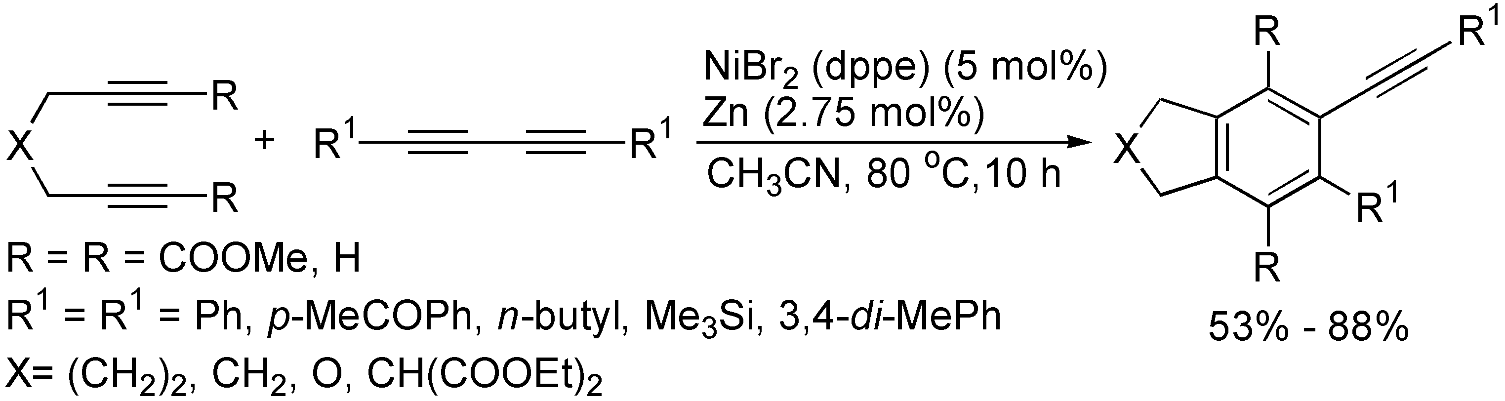 - Jeevanandam, A.; Korivi, R.P.; Huang, I.W.; Cheng, C.-H. Ni-catalyzed highly regio- and chemoselective cocycloaddition of nonconjugated diynes with 1,3-diynes: A novel method for polysubstituted arylalkynes. Org. Lett. 2002, 4, 807–810. [Google Scholar] [CrossRef]