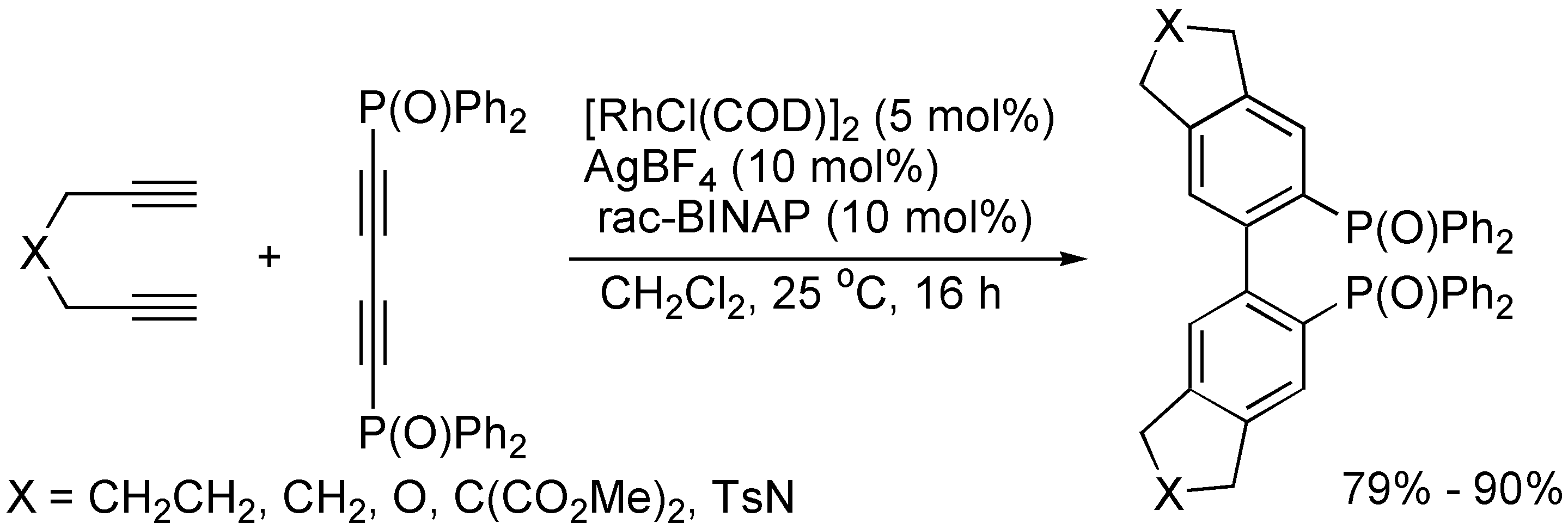 - Doherty, S.; Knight, J.G.; Smyth, C.H.; Harrington, R.W.; Clegg, W. Rhodium-catalyzed double [2+2+2] cycloaddition of 1,4-bis(diphenylphosphinoyl)buta-1,3-diyne with tethered diynes:A modular, highly versatile single-pot synthesis of nu-biphep biaryl diphosphines. Org. Lett. 2007, 9, 4925–4928. [Google Scholar] [CrossRef]