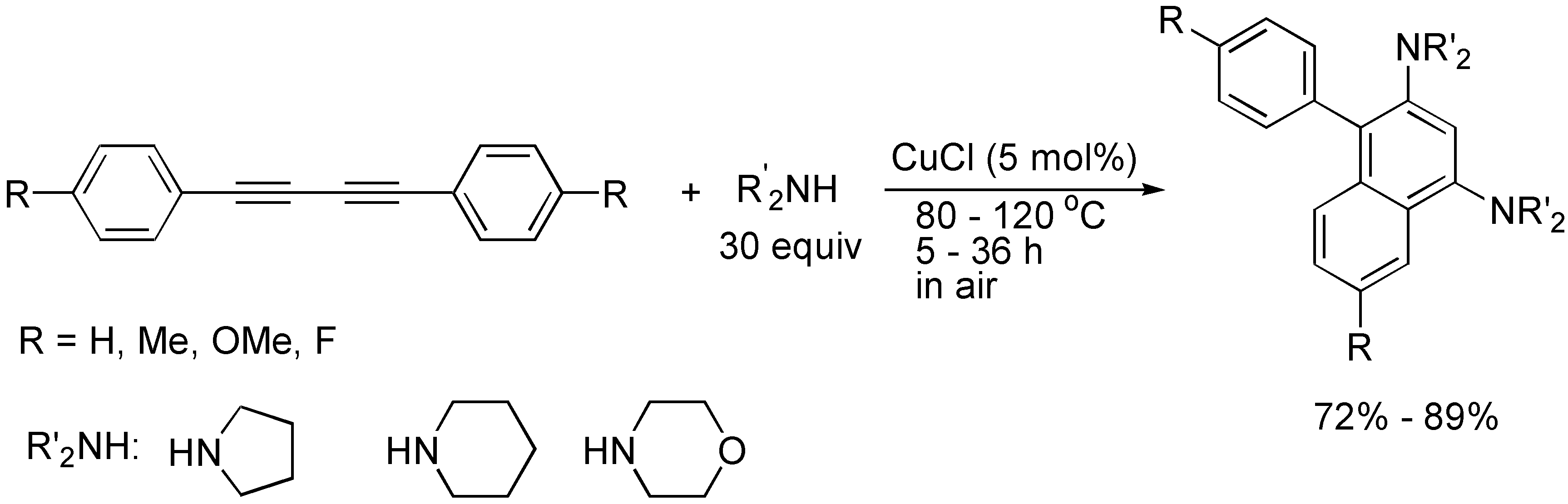 - Sun, H.; Wu, X.; Hua, R. Copper (I)-catalyzed reaction of diaryl buta-1,3-diynes with cyclic amines: An atom-economic approach to amino-substituted naphthalene derivatives. Tetrahedron Lett. 2011, 52, 4408–4411. [Google Scholar] [CrossRef]