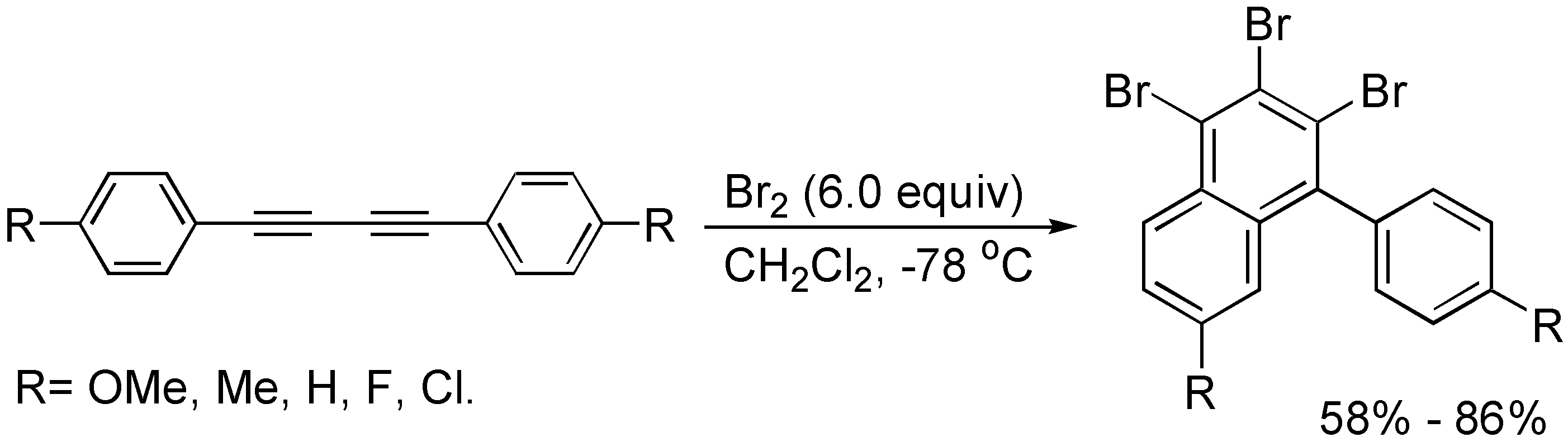 - Singha, R.; Nandi, S.; Ray, J.K. Bromine-mediated cyclization of 1,4-diaryl buta-1,3-diyne to 1,2,3-tribromo-4-aryl naphthalene. Tetrahedron Lett. 2012, 53, 6531–6534. [Google Scholar] [CrossRef]