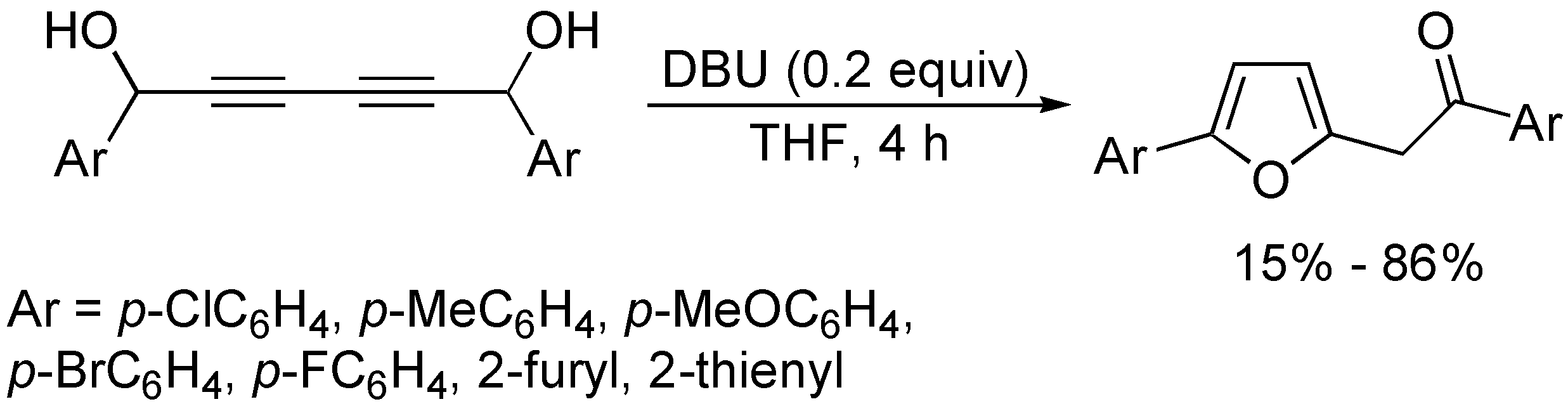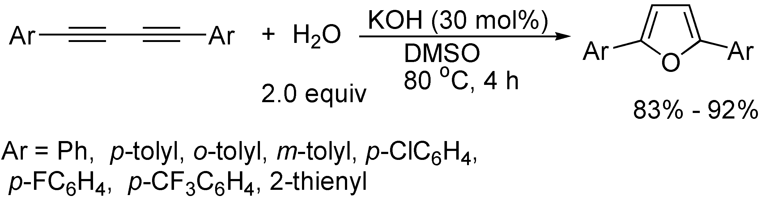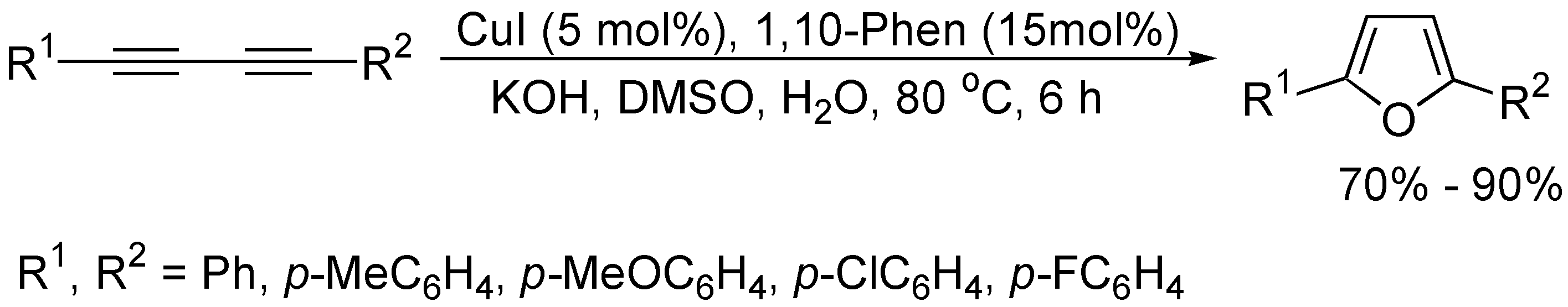 - Zheng, Q.; Hua, R.; Yin, T. Palladium-catalyzed cycloaddition of 1,3-butadiynes with water: An alternative efficient catalytic system for atom-economic synthesis of 2,5-disubstituted furans. Curr. Org. Synth. 2013, 10, 161–164. [Google Scholar]