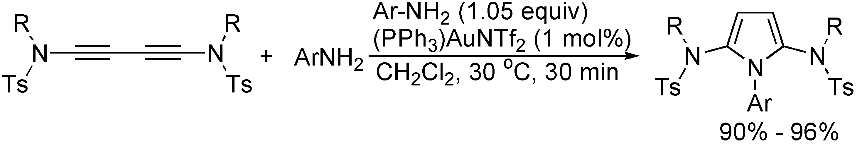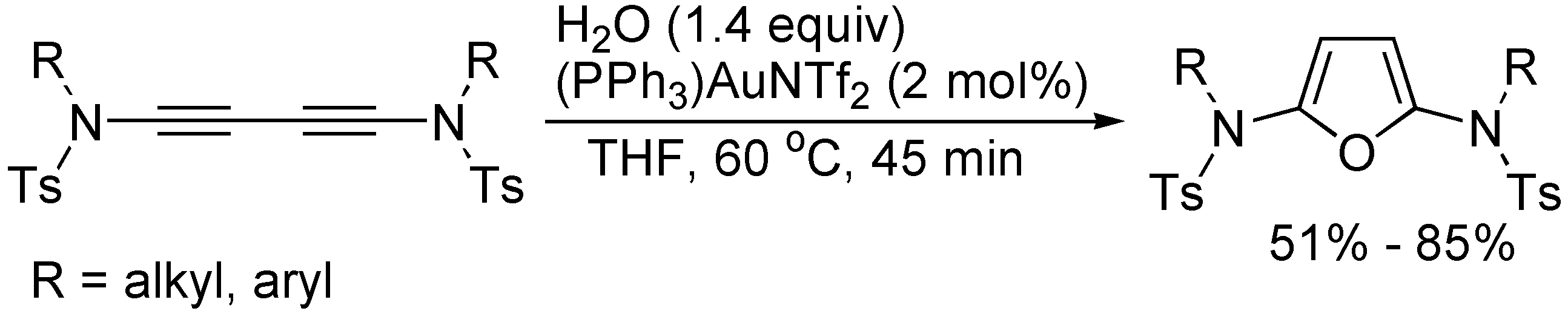 - Kramer, S.; Madsen, J.L.H.; Rottländer, M.; Skrydstrup, T. Access to 2,5-diamidopyrroles and 2,5-diamidofurans by Au(I)-catalyzed double hydroamination or hydration of 1,3-diynes. Org. Lett. 2010, 12, 2758–2761. [Google Scholar] [CrossRef]