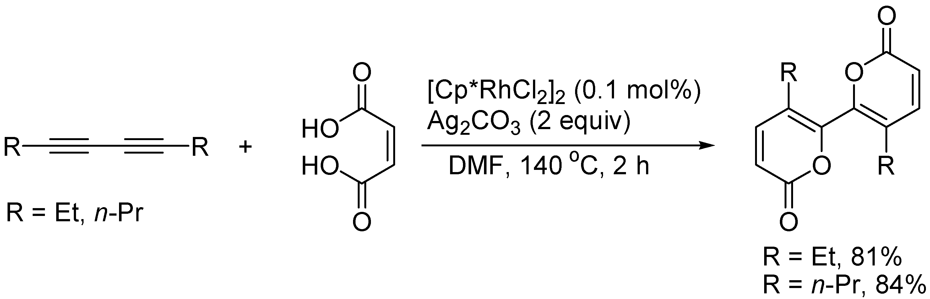 - Itoh, M.; Shimizu, M.; Hirano, K.; Satoh, T.; Miura, M. Rhodium-catalyzed decarboxylative and dehydrogenative coupling of maleic acids with alkynes and alkenes. J. Org. Chem. 2013, 78, 11427–11432. [Google Scholar] [CrossRef]