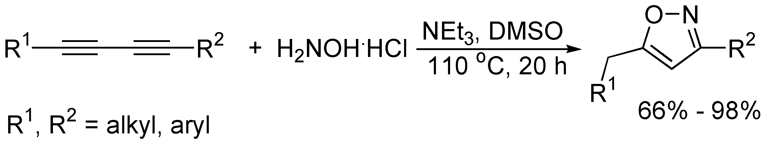 - Wang, L.; Yu, X.; Feng, X.; Bao, M. Synthesis of 3,5-disubstituted isoxazoles via cope-type hydroamination of 1,3-dialkynes. Org. Lett. 2012, 14, 2418–2421. [Google Scholar] [CrossRef]