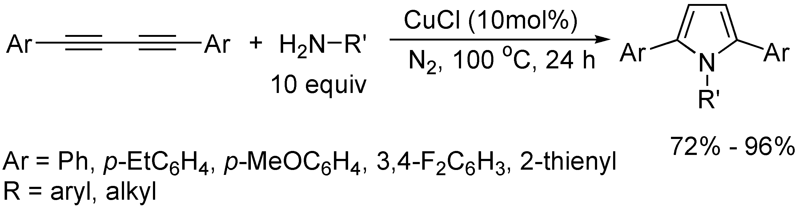 - Zheng, Q.; Hua, R. Cucl-catalyzed cycloaddition of 1,3-butadiynes with primary amines: An atom-economic process for synthesis of 1,2,5-trisubsituted pyrroles. Tetrahedron Lett. 2010, 51, 4512–4514. [Google Scholar] [CrossRef]
