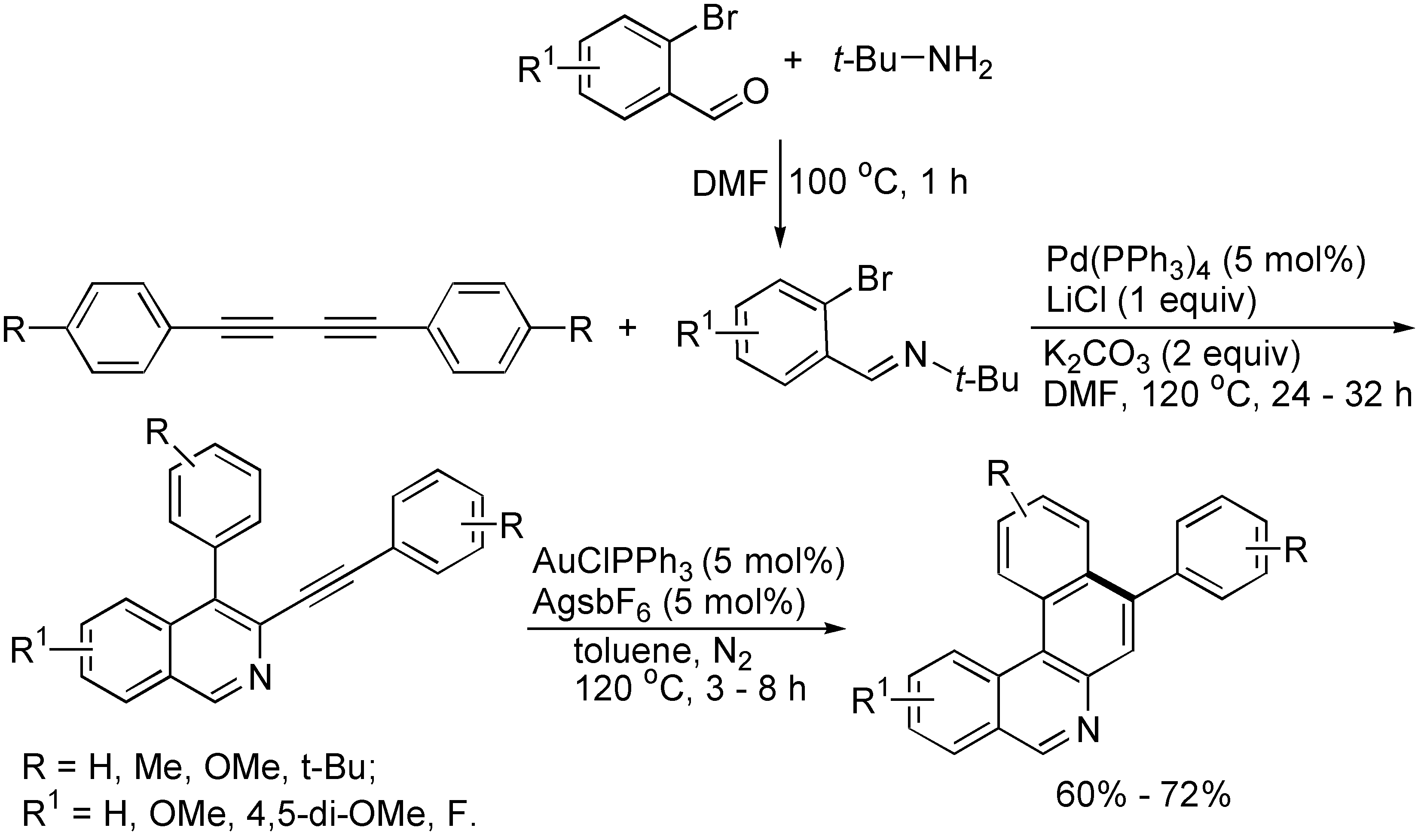 - Mandadapu, A.K.; Dathi, M.D.; Arigela, R.K.; Kundu, B. Synthesis of 8-aryl substituted benzo[a]phenanthridine derivatives by consecutive three component tandem reaction and 6-endo carbocyclization. Tetrahedron 2012, 68, 8207–8215. [Google Scholar] [CrossRef]