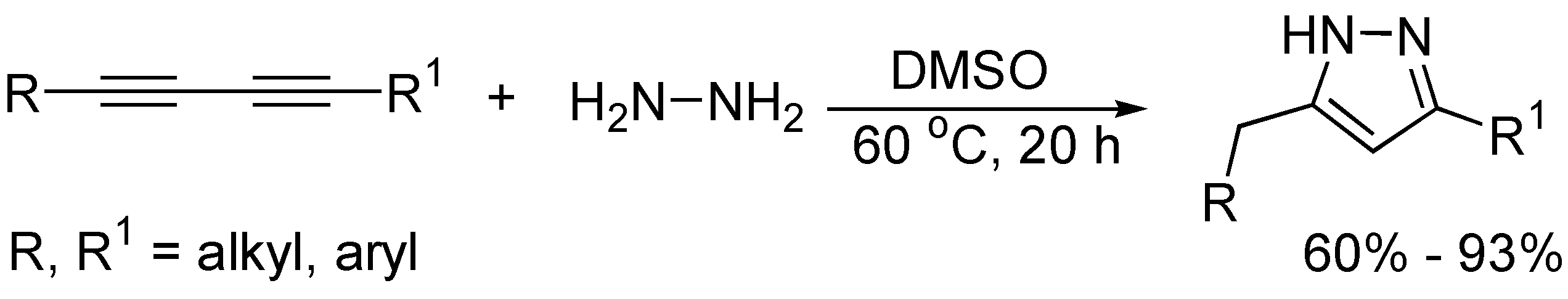 - Wang, L.; Yu, X.; Feng, X.; Bao, M. Synthesis of 3,5-disubstituted pyrazoles via cope-type hydroamination of 1,3-dialkynes. J. Org. Chem. 2013, 78, 1693–1698. [Google Scholar] [CrossRef]