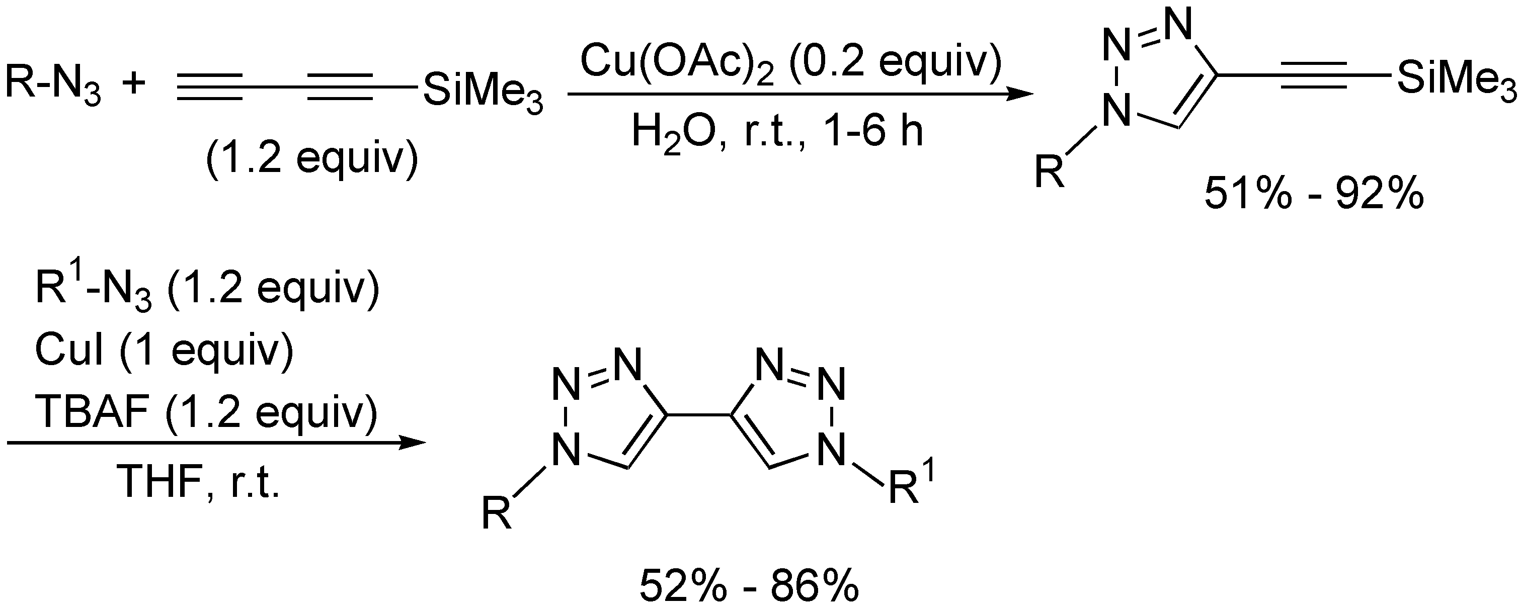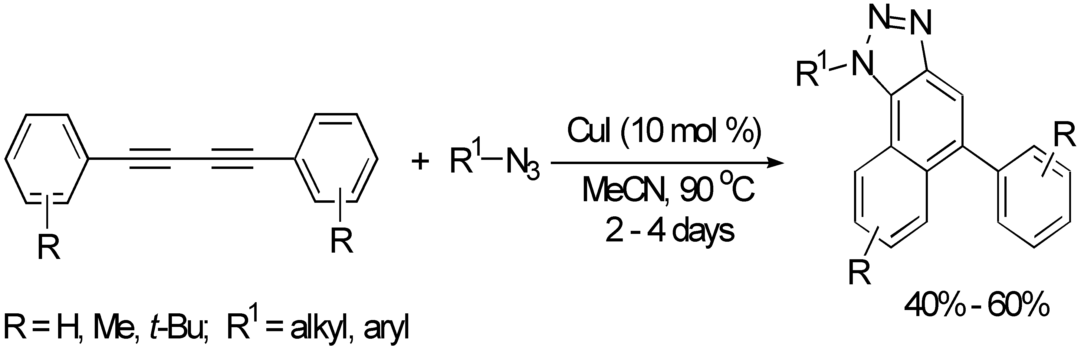 - Mandadapu, A.K.; Sharma, S.K.; Gupta, S.; Krishna, D.G.V.; Kundu, B. Unprecedented Cu-catalyzed coupling of internal 1,3-diynes with azides: One-pot tandem cyclizations involving 1,3-dipolar cycloaddition and carbocyclization furnishing naphthotriazoles. Org. Lett. 2011, 13, 3162–3165. [Google Scholar] [CrossRef]