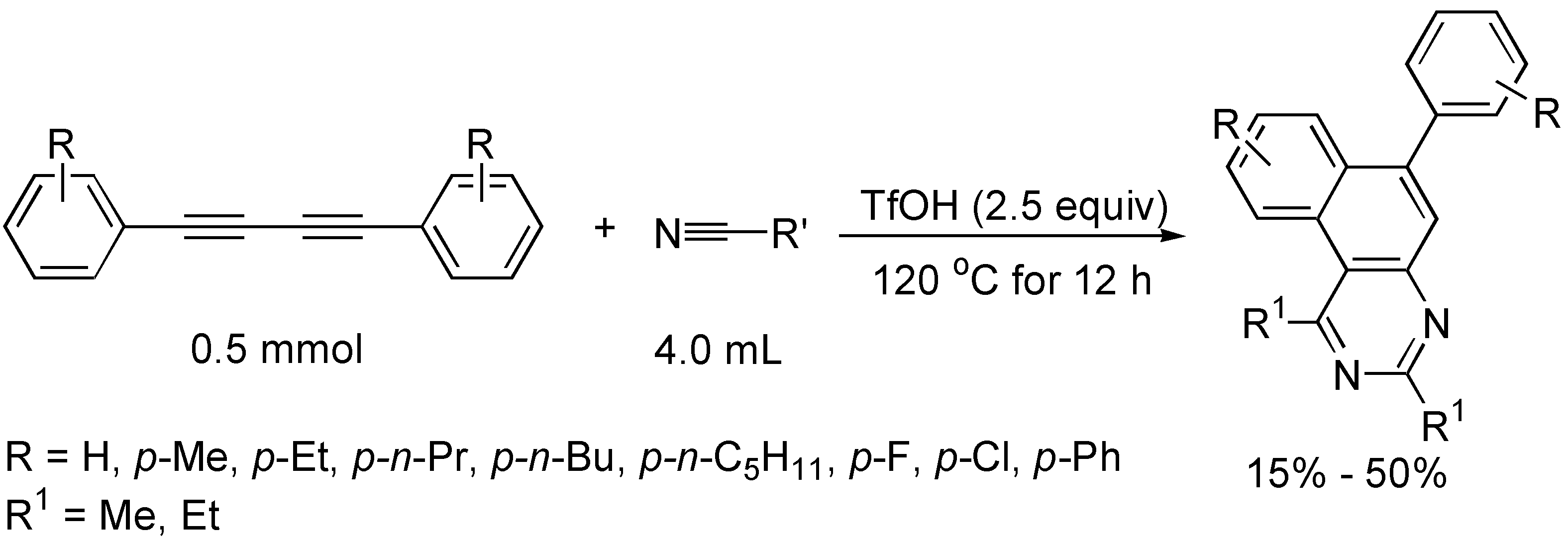 - Yang, L.; Hua, R. Cycloaddition of 1,4-diaryl-1,3-butadiynes with nitriles: An atom-economic one-pot approach to benzo[f]quinazolines. Chem. Lett. 2013, 42, 769–771. [Google Scholar] [CrossRef]