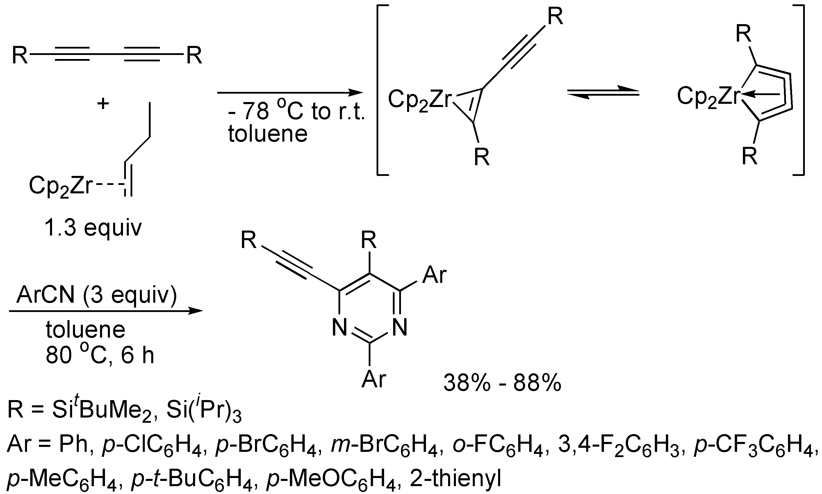 - You, X.; Yu, S.; Liu, Y. Reactions of zirconocene butadiyne or monoyne complexes with nitriles: Straightfoward synthesis of functionalized pyrimidines. Organometallics 2013, 32, 5273–5276. [Google Scholar] [CrossRef]