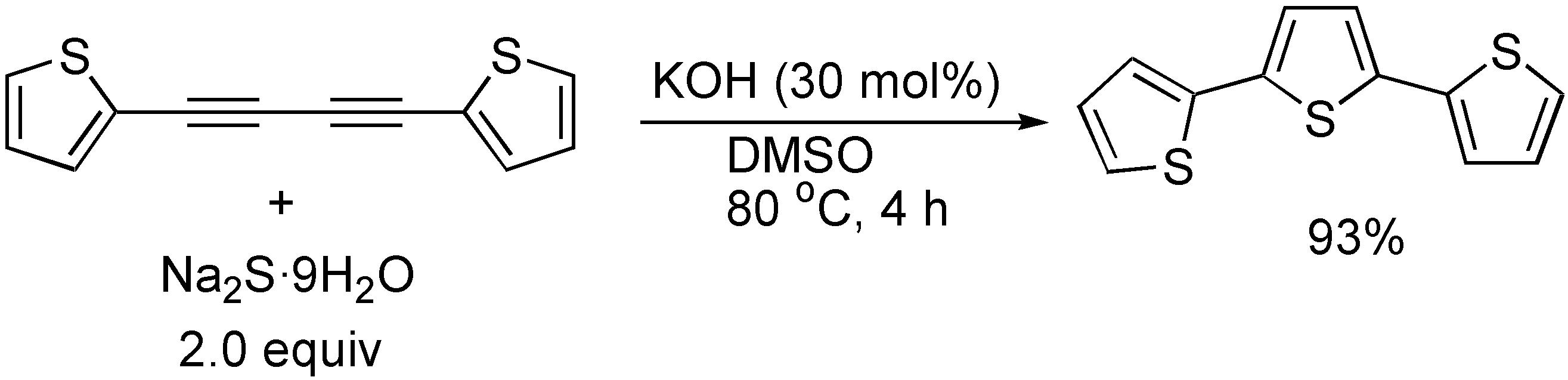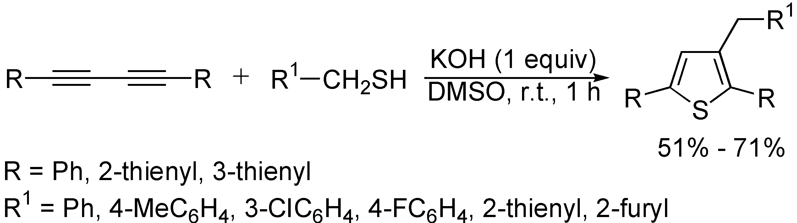 - Tang, J.; Zhao, X. Synthesis of 2,5-disubstituted thiophenes via metal-free sulfur heterocyclization of 1,3-diynes with sodium hydrosulfide. RSC Adv. 2012, 2, 5488–5490. [Google Scholar] [CrossRef]