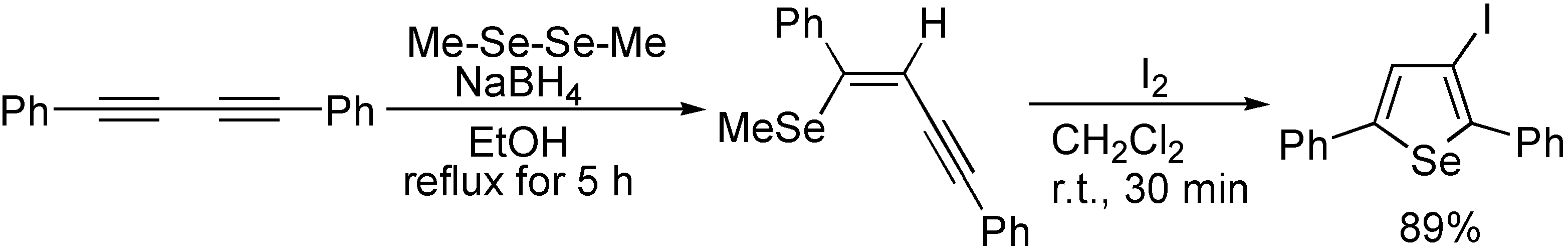- Alves, D.; Luchese, C.; Nogueira, C.W.; Zeni, G. Electrophilic cyclization of (z)-selenoenynes: Synthesis and reactivity of 3-iodoselenophenes. J. Org. Chem. 2007, 72, 6726–6734. [Google Scholar] [CrossRef]