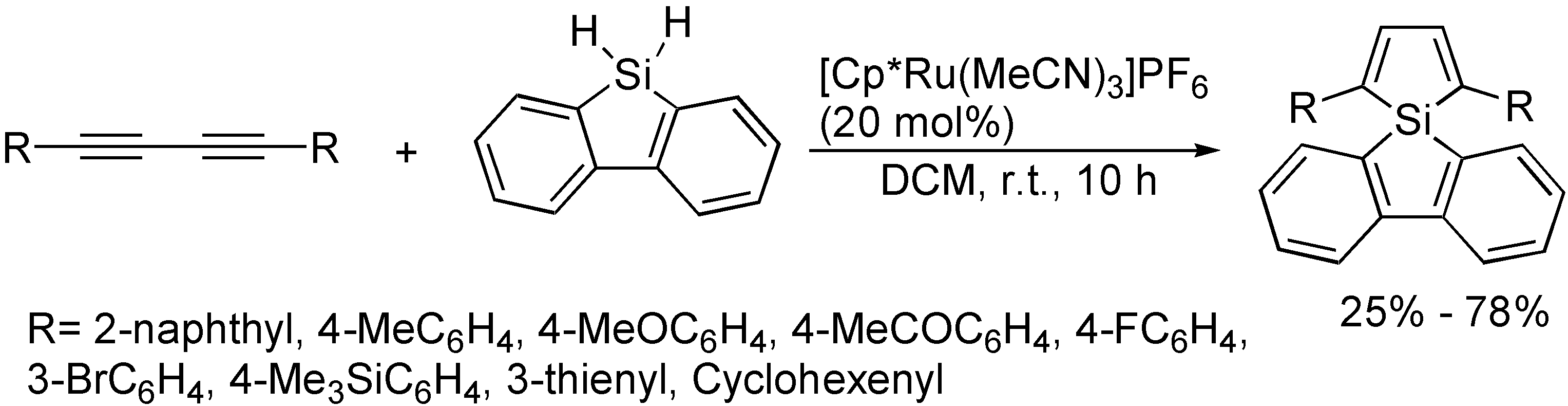 - Matsuda, T.; Kadowaki, S.; Murakami, M. Ruthenium-catalysed double trans-hydrosilylation of 1, 4-diarylbuta-1, 3-diynes leading to 2, 5-diarylsiloles. Chem. Commun. 2007, 2627–2629. [Google Scholar] [CrossRef]
