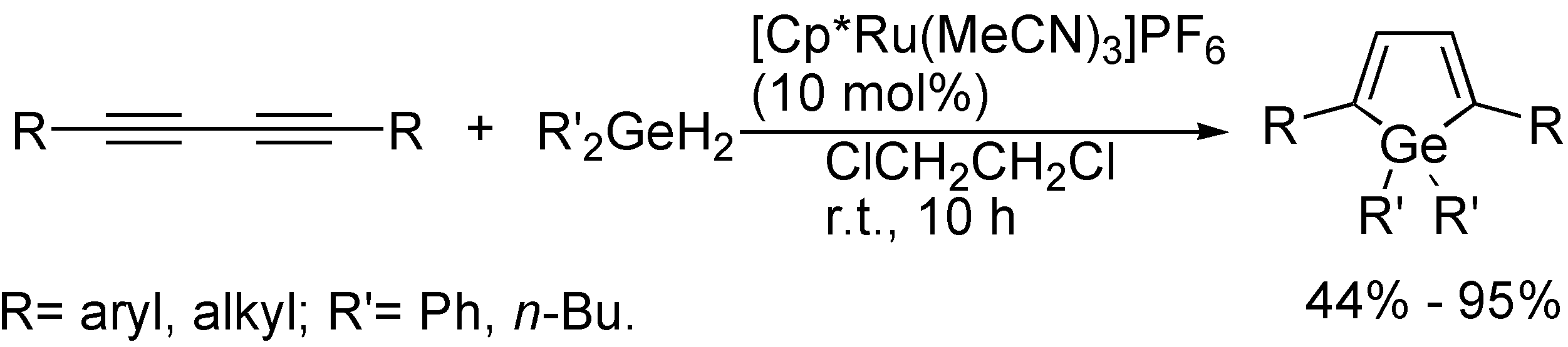 - Matsuda, T.; Kadowaki, S.; Yamaguchi, Y.; Murakami, M. Ruthenium-catalyzed trans-hydrogermylation of alkynes: Formation of 2,5-disubstituted germoles through double trans-hydrogermylation of 1,3-diynes. Org. Lett. 2010, 12, 1056–1058. [Google Scholar] [CrossRef]
