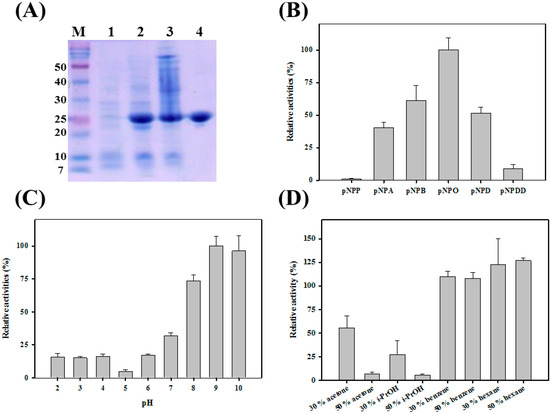 (A) SDS-PAGE analysis of PA27. Lane M, marker, lane 1 & 2; crude Escherichia coli extracts before and after induction; lane 3, supernatants of E. coli extracts; lane 4, PA27 after dialysis; (B) Substrate specificity of PA27 was investigated towards different p-NP esters; (C) pH stability of PA27; (D) Organic solvent-stable properties of PA27.